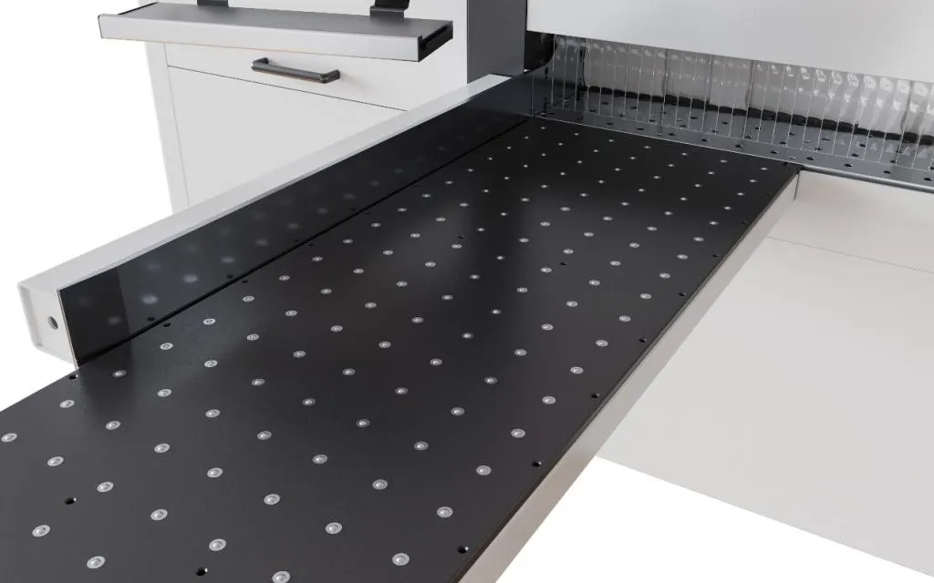 The high-efficiency auxiliary station of the panel saw. It sprays compressed air through dense air holes on the table to form an air film, greatly reducing the friction between the cut panel and the table, allowing the panel to slide out easily and stably, preventing panel scratches and collisions, and improving the smoothness of long panel discharging and production efficiency.
