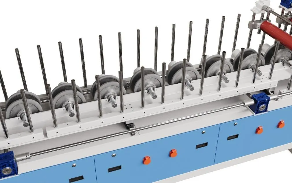 The core gluing station of door panel dual-use wrapping machine. With multiple adjustable rollers, it evenly applies cold glue or PUR hot melt on the back of decorative film, precisely controls glue thickness, ensuring stable and strong adhesion for door panel wrapping.